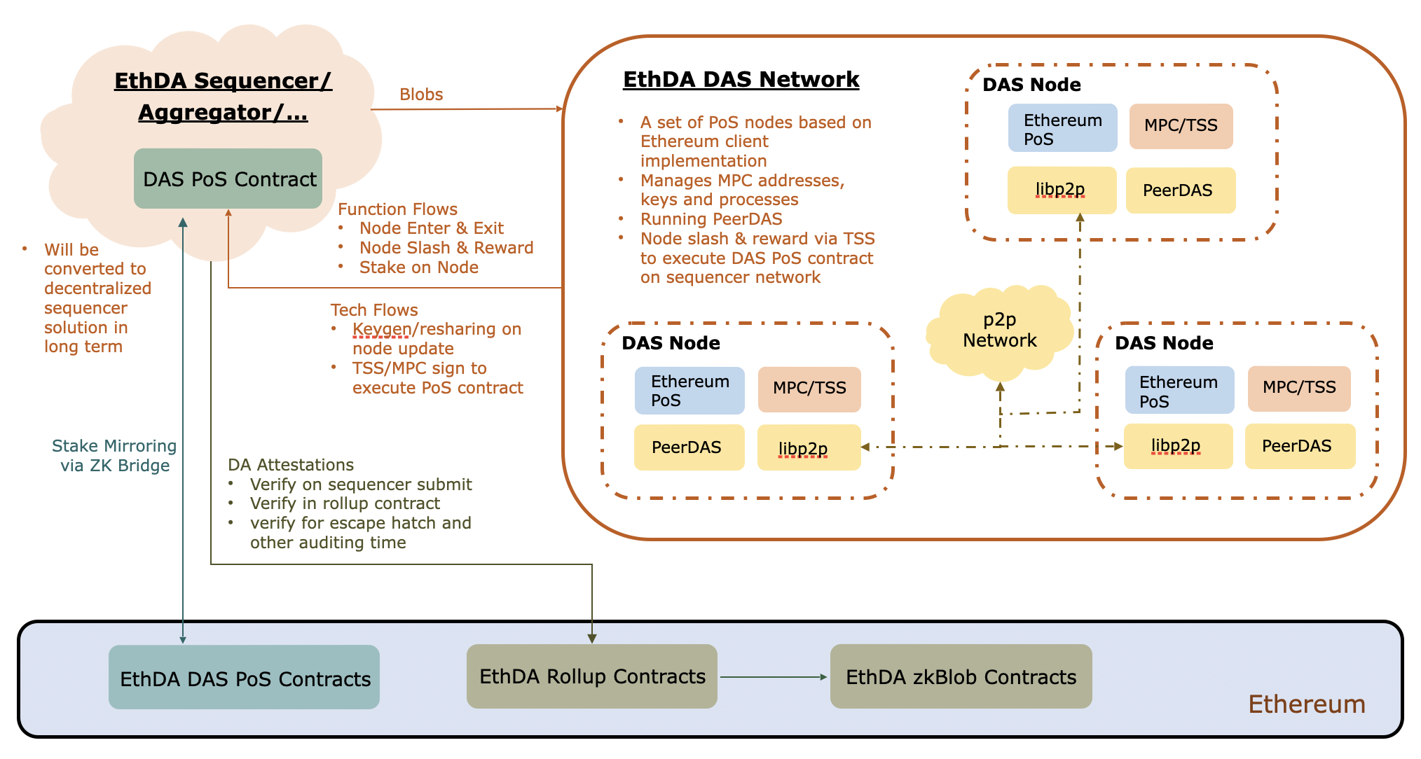 - EthDA DAS Network stores Blobs, performing DAS, and submits DA Attestations to DA Contracts on L1